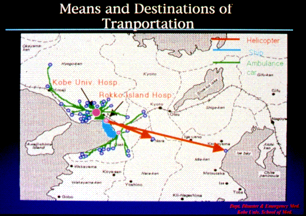 透析など集中治療継続が必要と判断したクラッシュ症候群患者17名を選び、1月19日から六甲アイランド病院を中継地点とし、15名を船で大阪天保山港へ、2名をヘリコプターにより転送したのだった。そこから先は大阪側で救命センターなどへ分散搬送 。この転送こそ、まさしくその後提唱される「広域医療搬送」をぶっつけ本番でやった格好だ。なお、このうち15名は生存退院し、腎機能も程なく回復し退院している。