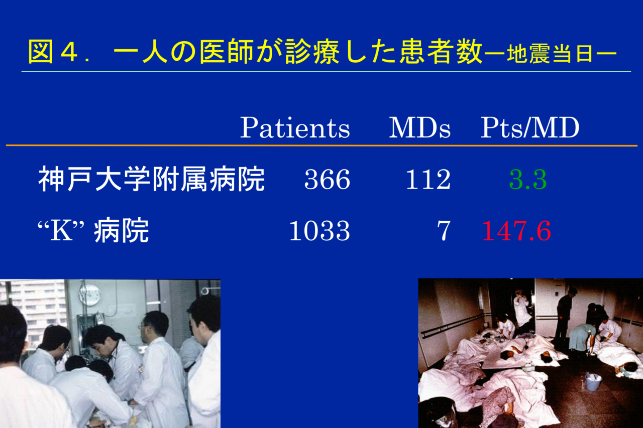大阪の熱心な一人の救急医曰く、「俺は自分の病院でベッドを開けて待っていた。なのに、いつまで経っても患者は送られて来えへんかった。神戸の医者はなんで転送せえへんかったんや!?」